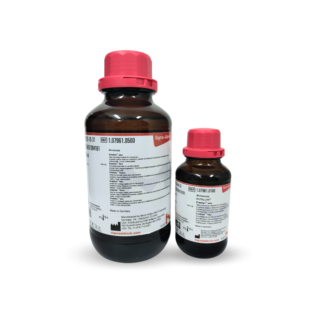 Entellan adalah media mounting berkualitas tinggi yang digunakan dalam preparasi mikroskopis untuk fiksasi dan pelapisan slide mikroskop. Produk ini berbasis resin sintetis yang cepat mengering dan memberikan transparansi optimal, ideal untuk aplikasi histologi dan sitologi. Entellan membantu melindungi preparat jangka panjang tanpa mengganggu pewarnaan, seperti pewarnaan hematoksilin-eosin atau Giemsa.