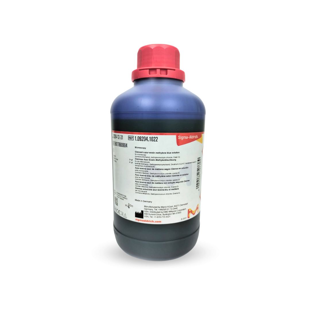 Giemsa’s Azur Eosin Methylene Blue Solution adalah larutan pewarna diferensial yang umum digunakan dalam laboratorium mikrobiologi dan histologi. Produk ini digunakan untuk pewarnaan sel darah, parasit darah (seperti Plasmodium), serta preparat jaringan untuk analisis mikroskopis. Mengandung campuran pewarna azur, eosin, dan metilen biru, larutan ini memberikan kontras yang jelas antara inti sel dan sitoplasma, sehingga mempermudah identifikasi struktur seluler